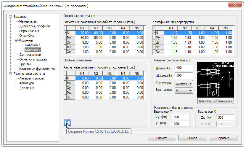 Расчет, проектирование и вычерчивание отдельного фундамента под сдвоенные одиночные железобетонные или металлические колонны произвольного положения и ориентации в плане в режиме прямой или обратной задачи (сборный и монолитный вариант исполнения для железобетонных колонн).